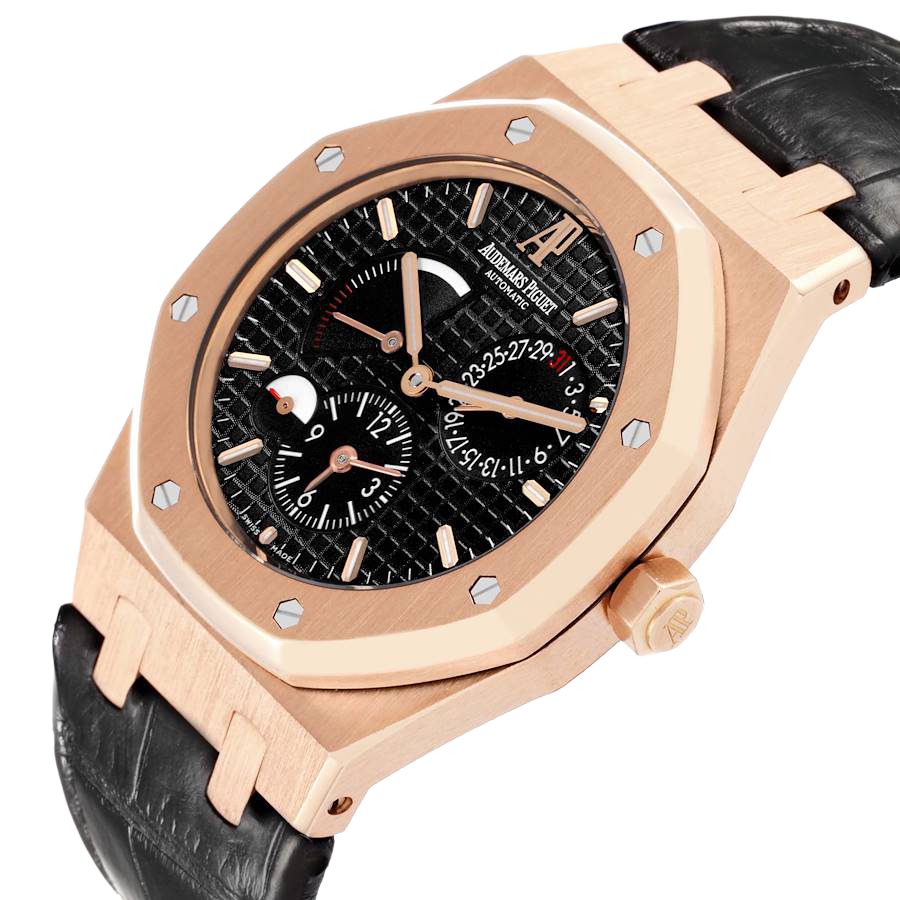 Dial: Metallic black dial with “Grande Tapisserie” waffle pattern, luminous baton hour markers and Royal Oak hands. 12-hour subdial with an am/pm indicator at the 6 o’clock position. Power reserve indicator located at the top left side of the dial. Date indicator sub-dial at the top right side of the dial.