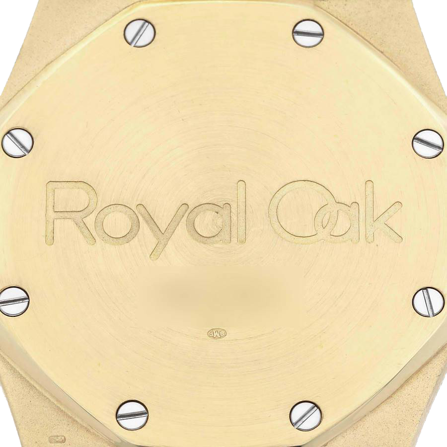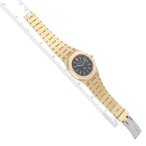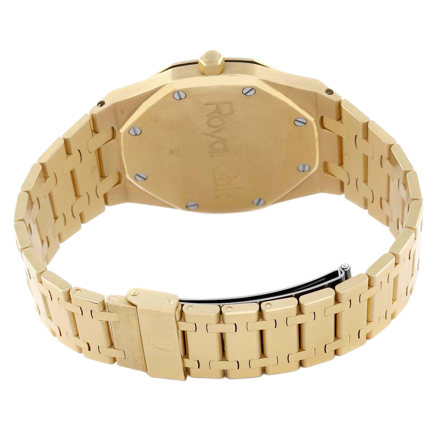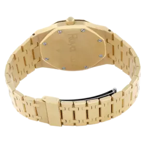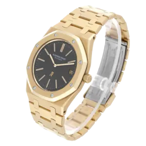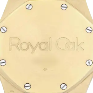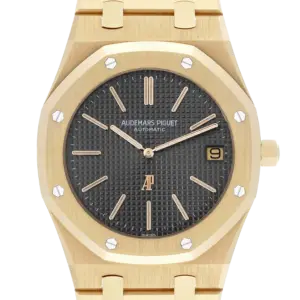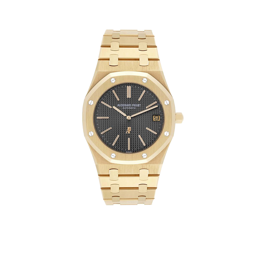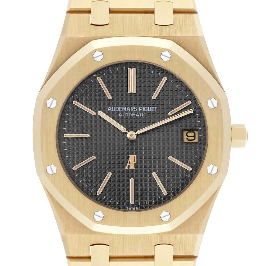 Dial: Grey dial with Mega Tapisserie waffle pattern, Raised gold luminous baton hour markers and Royal Oak hands. Date window at 3 o’clock aperture.