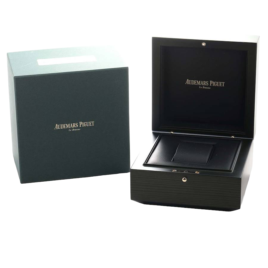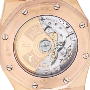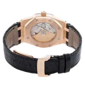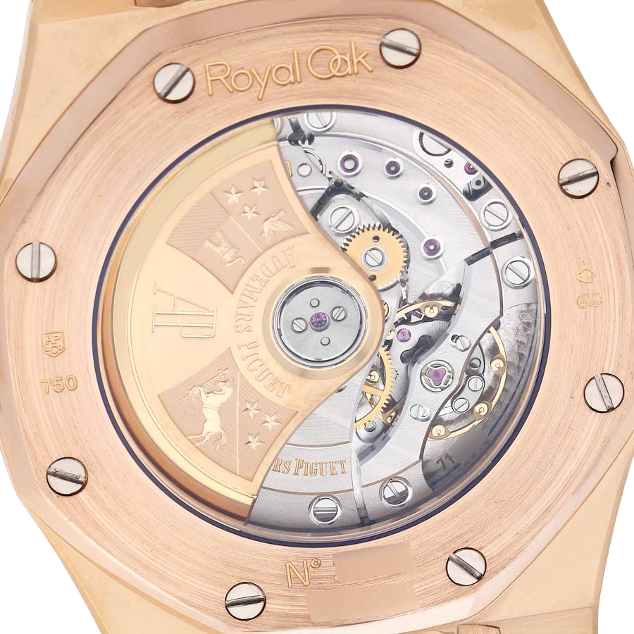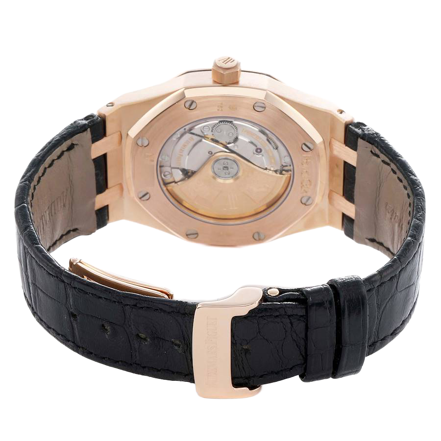 Case: 18k rose gold case 39.0 mm in diameter. Transparent exhibition saphire crystal case back. Audemars Piguet logo on the crown.