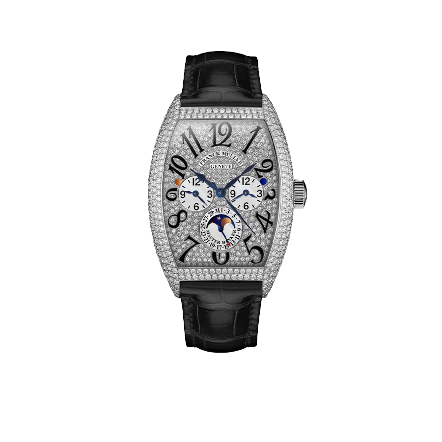 The Cintrée Curvex Master Banker Moon Phase is a masterpiece of haute horology, blending bold aesthetics with unparalleled functionality. Designed for modern global travelers, this timepiece features a moon phase and date in addition to an innovative triple time zone complication with day/night indicators tracking time to the minute in three separate locations around the globe. Encased in the signature Cintrée Curvex silhouette paved in 575 diamonds on the case, dial, and buckle, this Master Banker is a statement piece combining a masterful mechanism within a shimmering cocoon of 18kt white gold. The dial is a stunning display of craftsmanship, adorned in diamonds with applique’ numerals in Franck Muller’s iconic style. At its heart, the Master Banker is powered by a self-winding mechanical movement, engineered in-house by Franck Muller to deliver precision and reliability. With an impressive power reserve and a high level of finishing, this movement is as striking as it is functional. A comfortable hand-stitched strap with an 18kt white gold & diamond-set buckle completes the look and secures the Master Banker comfortably on the wrist. Perfect for jetsetters connoisseurs alike, the Franck Muller Cintrée Curvex Master Banker is a testament to innovation, elegance, and the brand’s commitment to horological excellence.