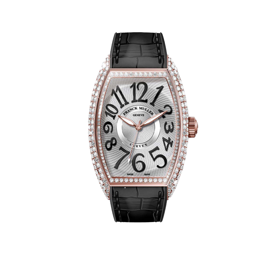 Franck Muller’s Curvex CX represents a subtle evolution of the iconic Cintree Curvex tonneau that extends the arched sapphire crystal over the ends of the bezel in a refined timepiece with sleek lines. In this version, the arched case holds a captivating silver dial embossed with a Clous de Paris spiral pattern under mechanically fixed applique’ numerals. Its minimalist design is framed with 322 brilliant cut diamonds hand set into the 18kt Rose Gold case blending sophistication with a contemporary edge. Powered by an automatic Swiss movement completely decorated, built, and regulated in-house by Franck Muller, this watch combines precision and style and the perfect accessory for those special occasions.