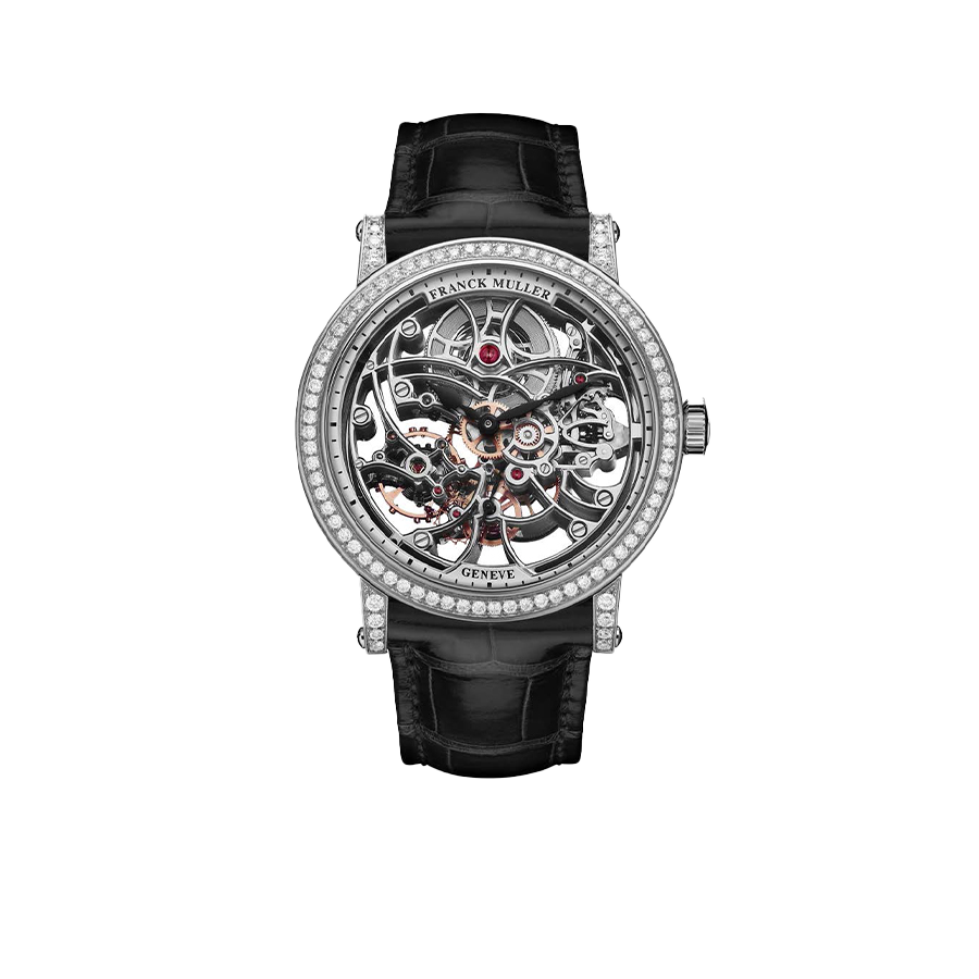 Housed in a sleek round 18k white gold case, the fully openworked movement is on full display, suspended within a transparent architectural framework. Every bridge, gear, and spring barrel is meticulously hand-finished—showcasing polished bevels, Geneva stripes, and thoughtful symmetry that reflect Franck Muller’s dedication to horological excellence.