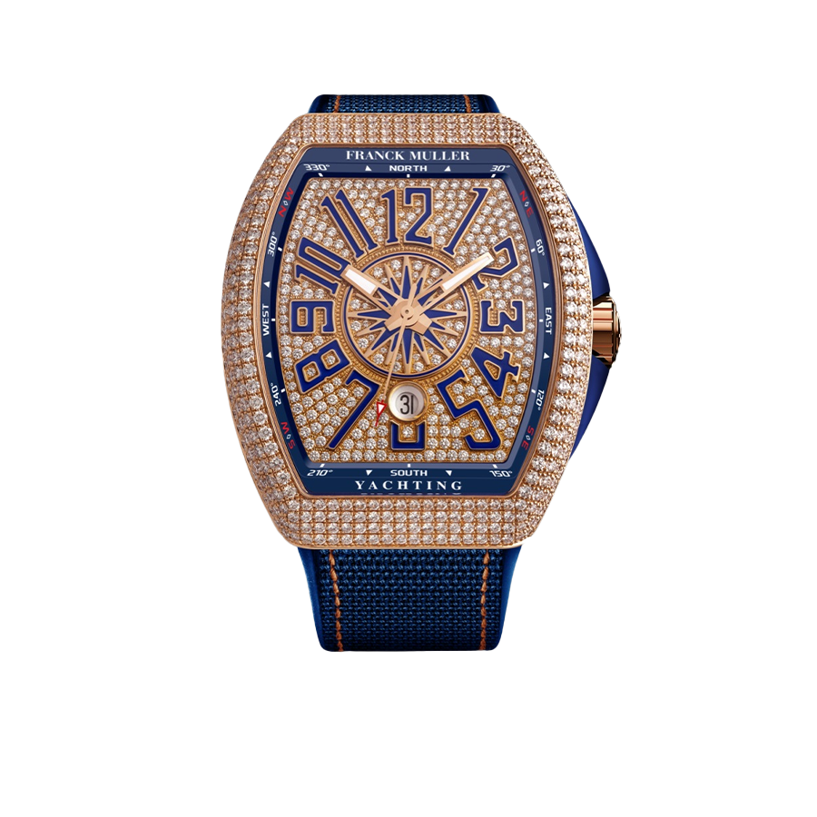 The Yachting Collection develops a new creative vision of time with its nautical details including the wind rose adorning the dial. Surrounded by a fully diamond-set dial, the distinct Vanguard numerals complement the unapologetically audacious design and enhance its legibility. Inside the18kt rose gold & diamond-clad case beats a Swiss automatic movement that is completely decorated, assembled, regulated. This maritime machine is comfortably held fast by a hand sewn alligator & rubber strap with color-matched stitching and is the ideal timepiece to celebrate the sporting life inspired by the sea.