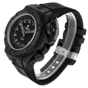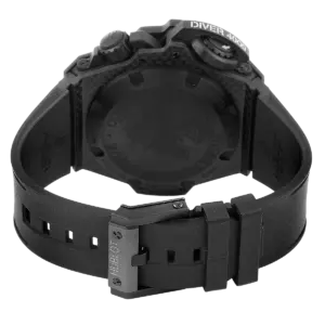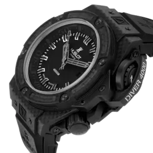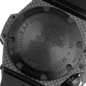 Case: Black carbon fiber titanium case 48.0 mm in diameter. Inner bezel rotation crown at 3 o’clock. Musee Oceanographique Monaco engraving on a caseback. Standard time correction crown located at the 4 o’clock. Helium escape valve locate on the case edge at the 10 o’clock. The diving bezel is operated using the over-sized crown located on the case edge at the 2 o’clock