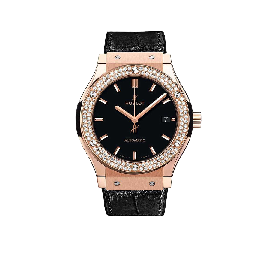 This timepiece features a 42mm gold case paired with a high quality leather strap. It showcases a distinctive black dial and is powered by a precise automatic winding movement. The watch is designed with a water resistance of up to 50m.