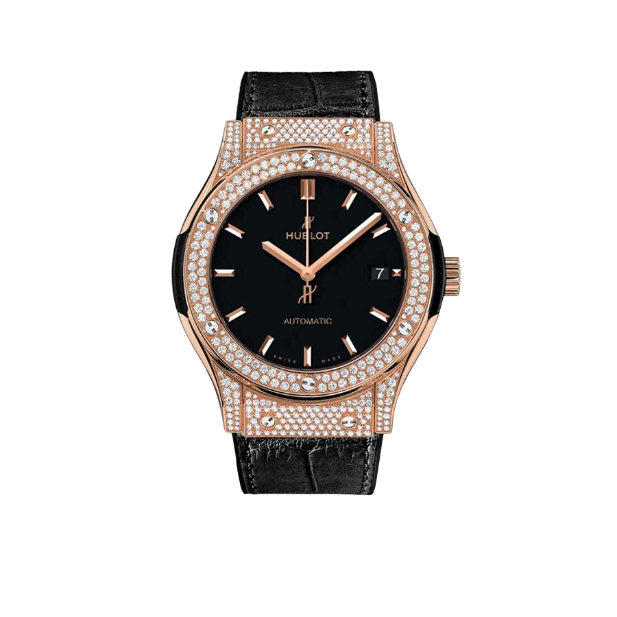 This timepiece features a 42mm gold case paired with a high quality leather strap. It showcases a distinctive black dial and is powered by a precise automatic winding movement. The watch is designed with a water resistance of up to 50m.
