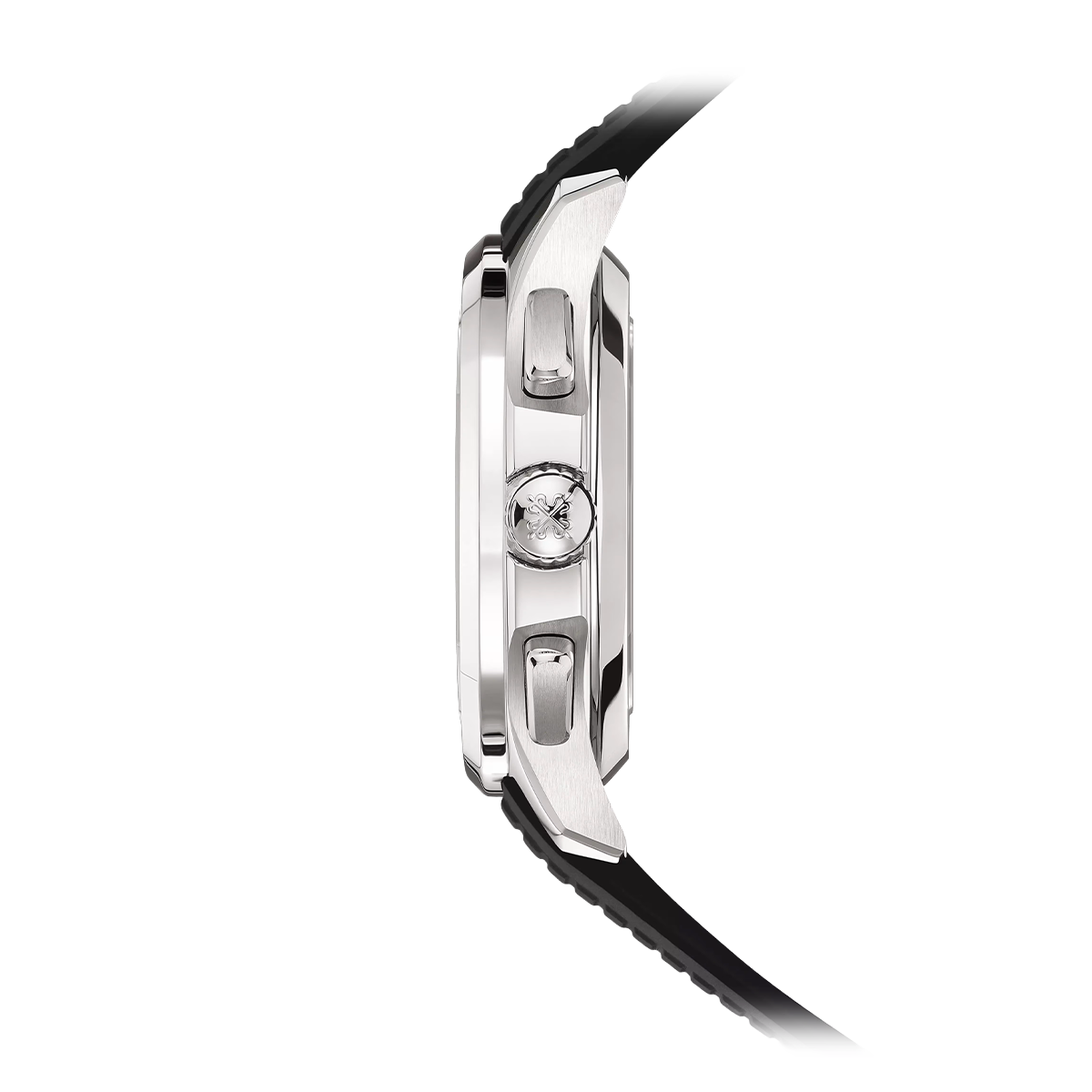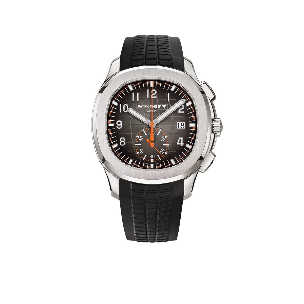 Equipped with a self-winding flyback chronograph movement, this steel Aquanaut features a strikingly original design, with the chronograph indications standing out in orange against the black dial background. It comes with two black or orange straps in an ultra-sturdy composite material, secured by an Aquanaut fold-over clasp.