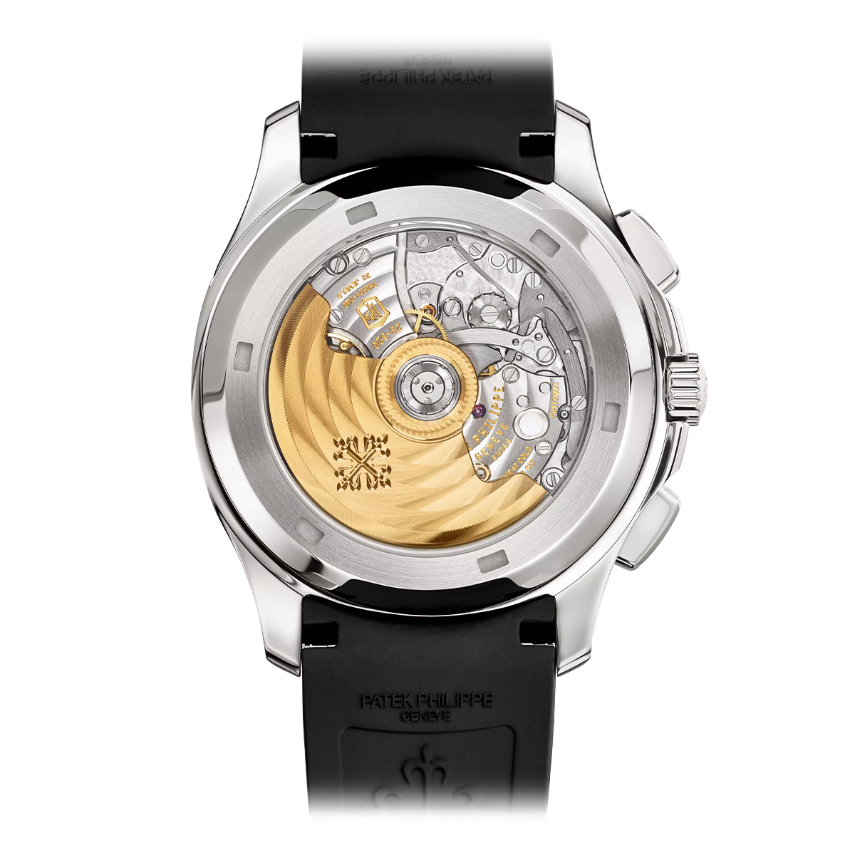 Dial: Sunburst charcoal gray with black-gradient rim, embossed Aquanaut pattern, white gold applied numerals with white luminescent coating. White gold baton-style hands with white luminescent coating.
