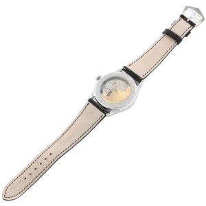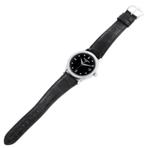 Bracelet: Black leather strap with an 18k white gold tang buckle.