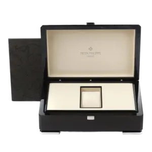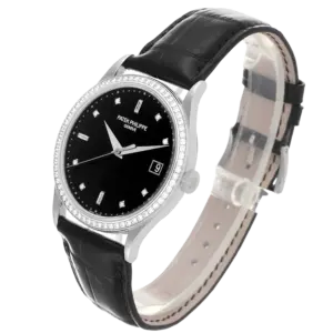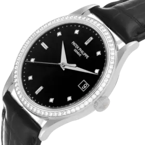 Dial: Black dial with white gold dauphine hands and original Patek Philippe factory diamond hour markers. Gold-rimmed date calendar window at the 3 o’clock aperture.