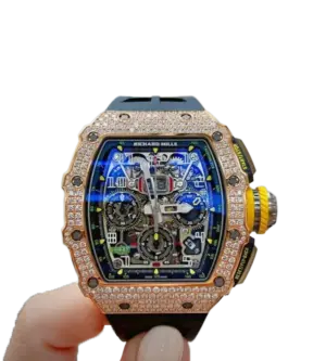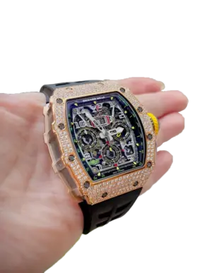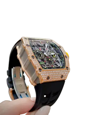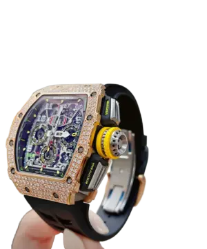 Paired with a white rubber strap and a rose gold folding clasp, the RM 11-03 is a harmonious fusion of cutting-edge engineering and high jewelry craftsmanship. This timepiece is an extraordinary choice for collectors who value Richard Mille’s technical innovation and striking design.