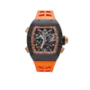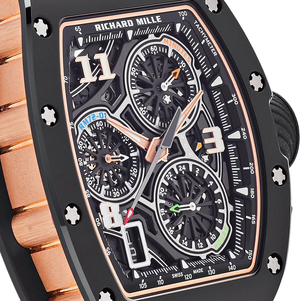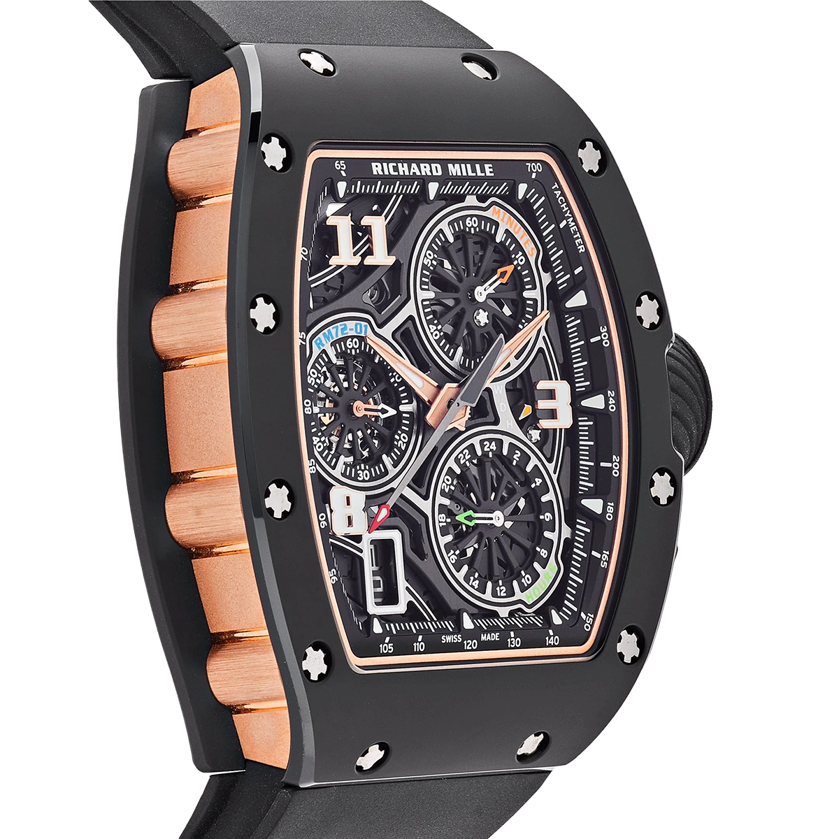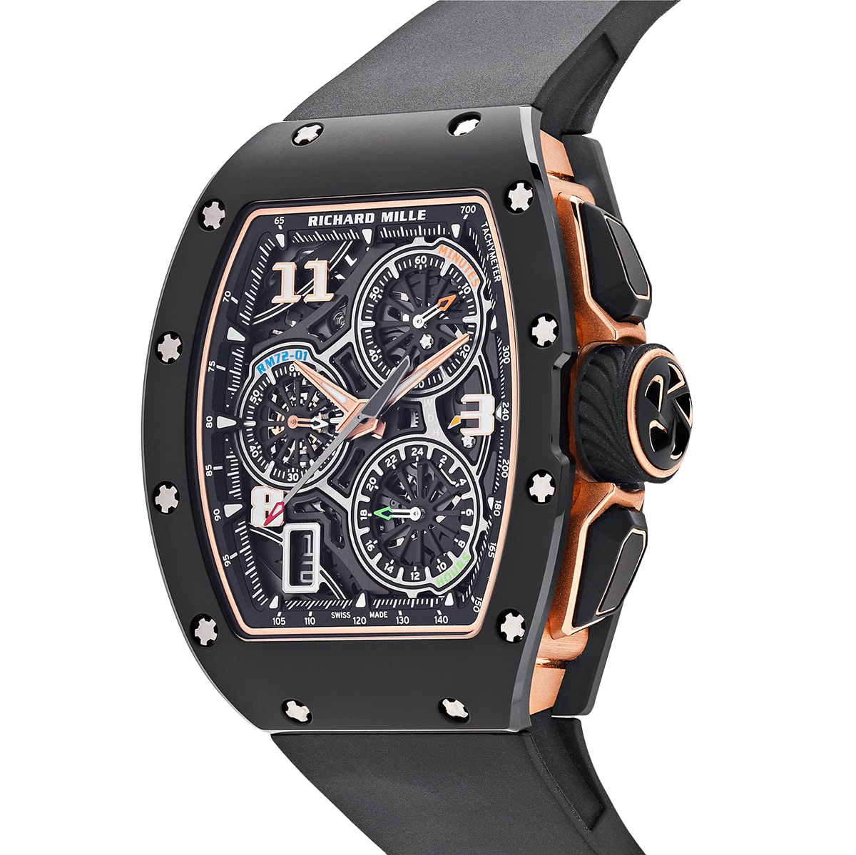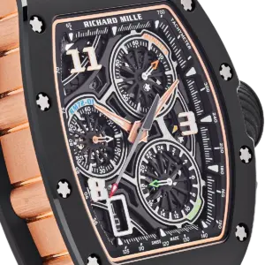 At the heart of the RM 72-01 is the CRMC1 caliber, a flyback chronograph movement developed entirely in-house. This movement features a unique double-tilting pinion clutch system, allowing for seamless operation of the chronograph functions without compromising the timekeeping accuracy. The dial layout includes a 60-minute counter at 2 o’clock, a 24-hour counter at 5 o’clock, and a small seconds subdial at 9 o’clock, all accented with color-coded hands for enhanced legibility. With a 50-hour power reserve and a design that harmonizes form and function, the RM 72-01 stands as a testament to Richard Mille’s innovative spirit and dedication to horological excellence.