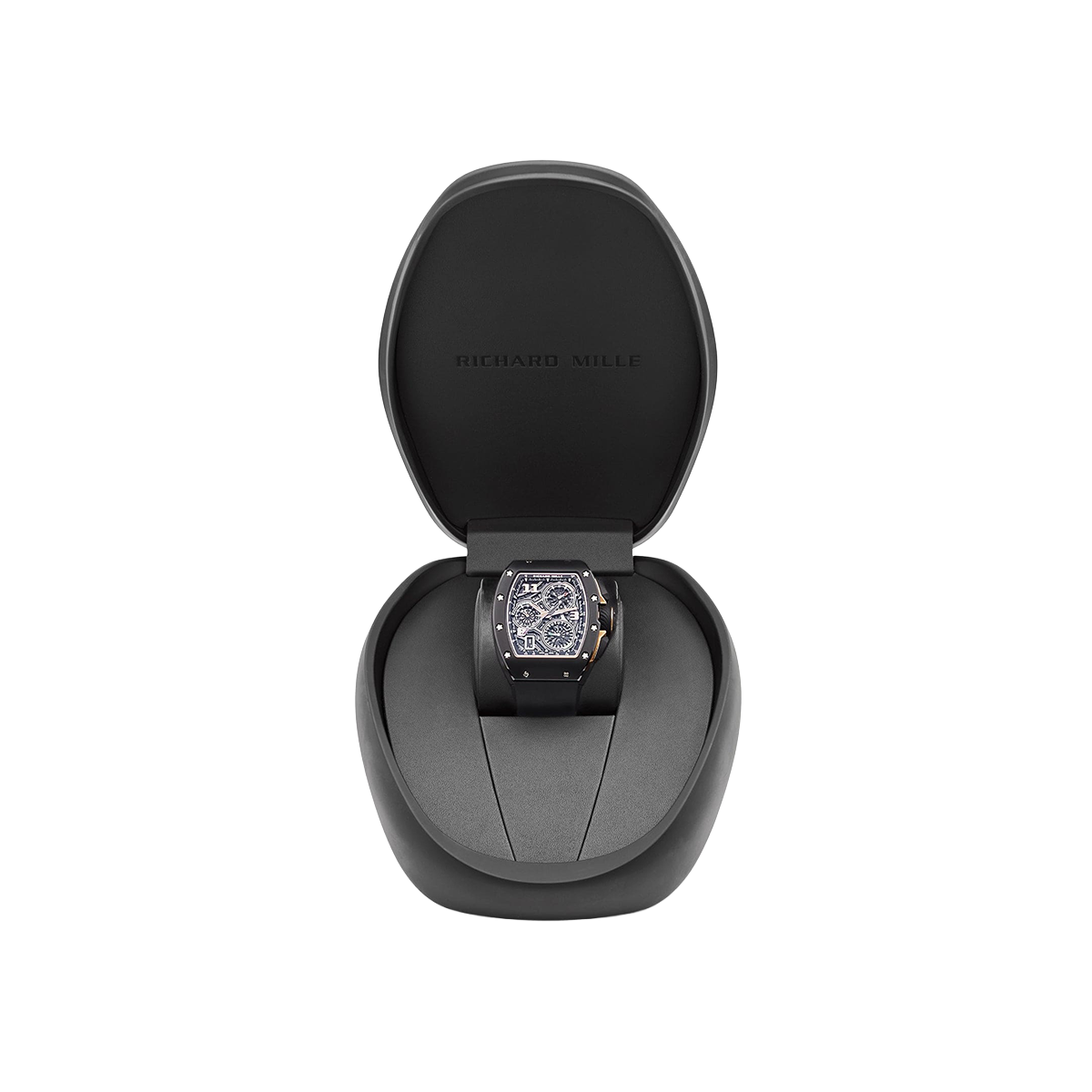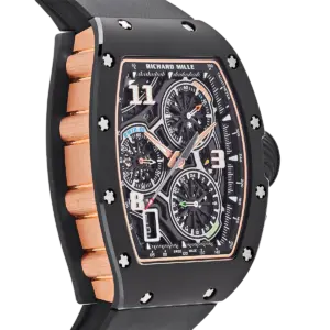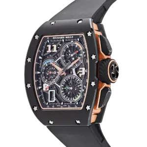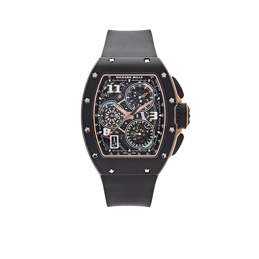 The Richard Mille RM 72-01 Lifestyle In-House Chronograph in black ceramic represents a pivotal moment in the brand’s evolution, marking the debut of its first fully in-house chronograph movement. Crafted from TZP black ceramic, the tonneau-shaped case measures 38.4 x 47.34 mm and is complemented by a skeletonized dial that reveals the intricate mechanics within. The watch’s architecture is both bold and refined, embodying Richard Mille’s commitment to avant-garde design and technical mastery.