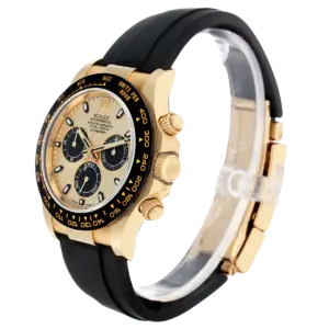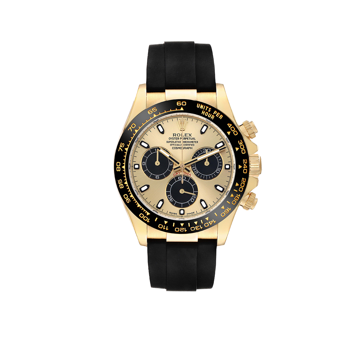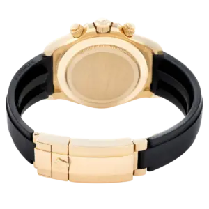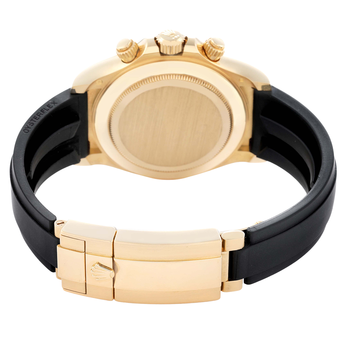 Bracelet: Black rubber oysterflex strap with an 18k yellow gold flip-lock clasp.