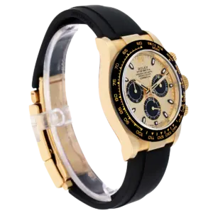 Case: 18K yellow gold oyster case 40.0 mm in diameter. Special screw-down push buttons operate the chronograph functions. Pointed crown guards. Rolex logo on the 18k yellow gold crown.