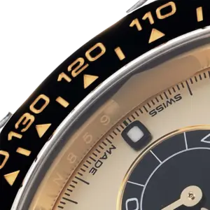 Bezel: Black Cerachrom ceramic bezel engraved with the yellow gold moulded tachymeter scale.