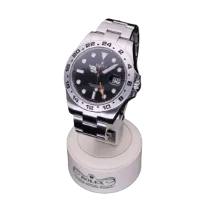 The Oyster Perpetual Explorer II is the watch of choice for those who venture to the far corners of the globe. Introduced in 1971, it was designed for extreme conditions and enables the wearer to distinguish daytime from night-time hours thanks to its additional 24-hour hand that points to the engraved 24-hour graduation on the bezel.
