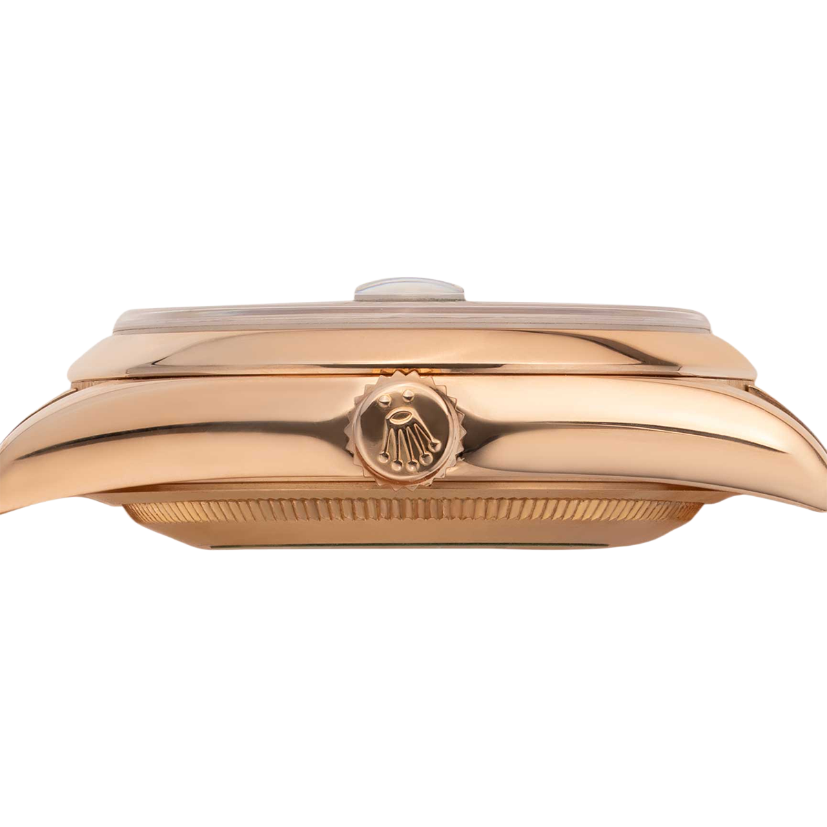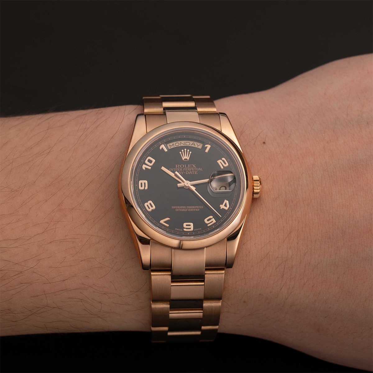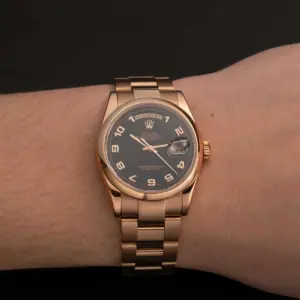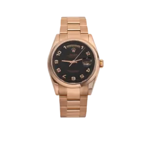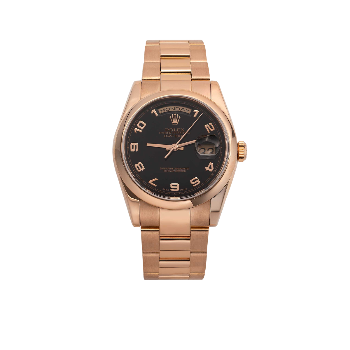 Here’s a Day-Date Rolex Watch. From our Watches Collection, this Brown Arabic Dial Smooth Bezel Day-Date Rolex features 18K Gold Case and Oyster bracelet.